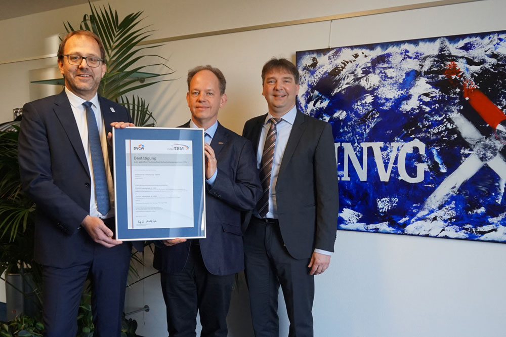 Von links: Frank Schupp (Geschäftsführer HVG), Thomas Anders (Geschäftsführer DVGW-Landesgruppe Baden-Württemberg) und Jürgen Peiler (Leiter Technik der HVG) bei der Übergabe der Urkunde zum geprüften Technischen Sicherheitsmanagement.