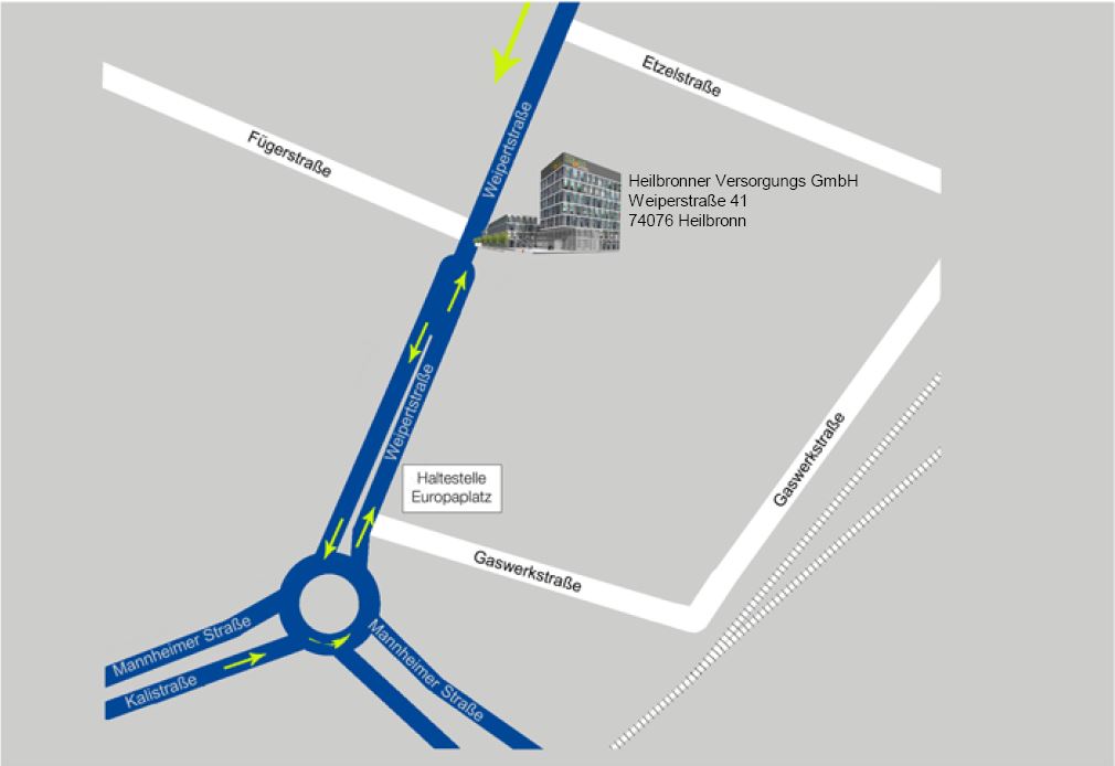 Von der A6 die Abfahrt Heilbronn-Zentrum/Neckarsulm/Mosbach nehmen und Richtung Heilbronn/Neckarsulm abfahren. Der B27 folgen und an der ersten Kreuzung in die Karl-Wüst-Straße rechts abbiegen. Anschließend an der nächsten Kreuzung links in die Austraße abbiegen. Im Kreisverkehr am Industrieplatz die zweite Ausfahrt nehmen, Einfahrt in der Weipertstraße. Im Kreisverkehr am Europaplatz die dritte Ausfahrt nehmen, um in die Gegenrichtung der Weipertstraße zu gelangen. Das Gebäude befindet sich auf der rechten Seite.